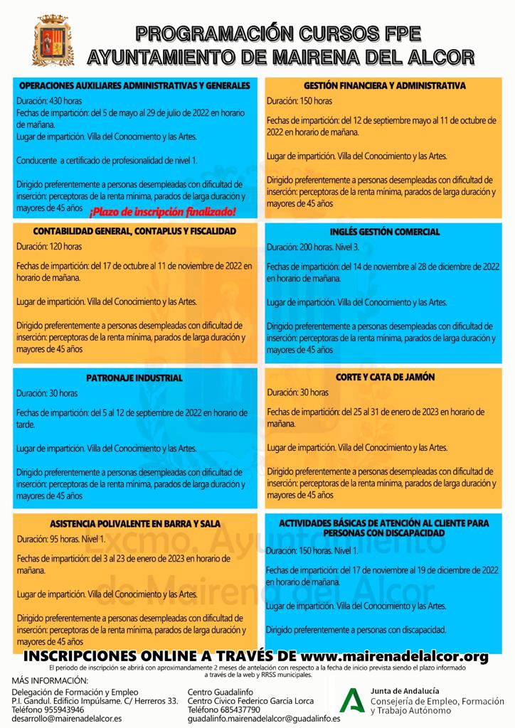 “Todas las inscripciones se pueden hacer por dos vías, presencial cumplimentando la solicitud en el Edificio Impúlsame (C/ Los Herreros, 33), el Centro Guadalinfo (C/ Pinar, 29) o en el Registro Municipal (C/ Azahar s/n), y online en la página que la Junta de Andalucía habilita para este fin. La inscripción se habilita unos dos meses antes de la fecha de inicio del curso”.