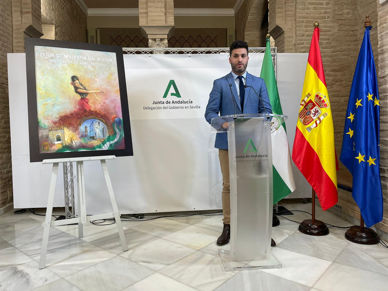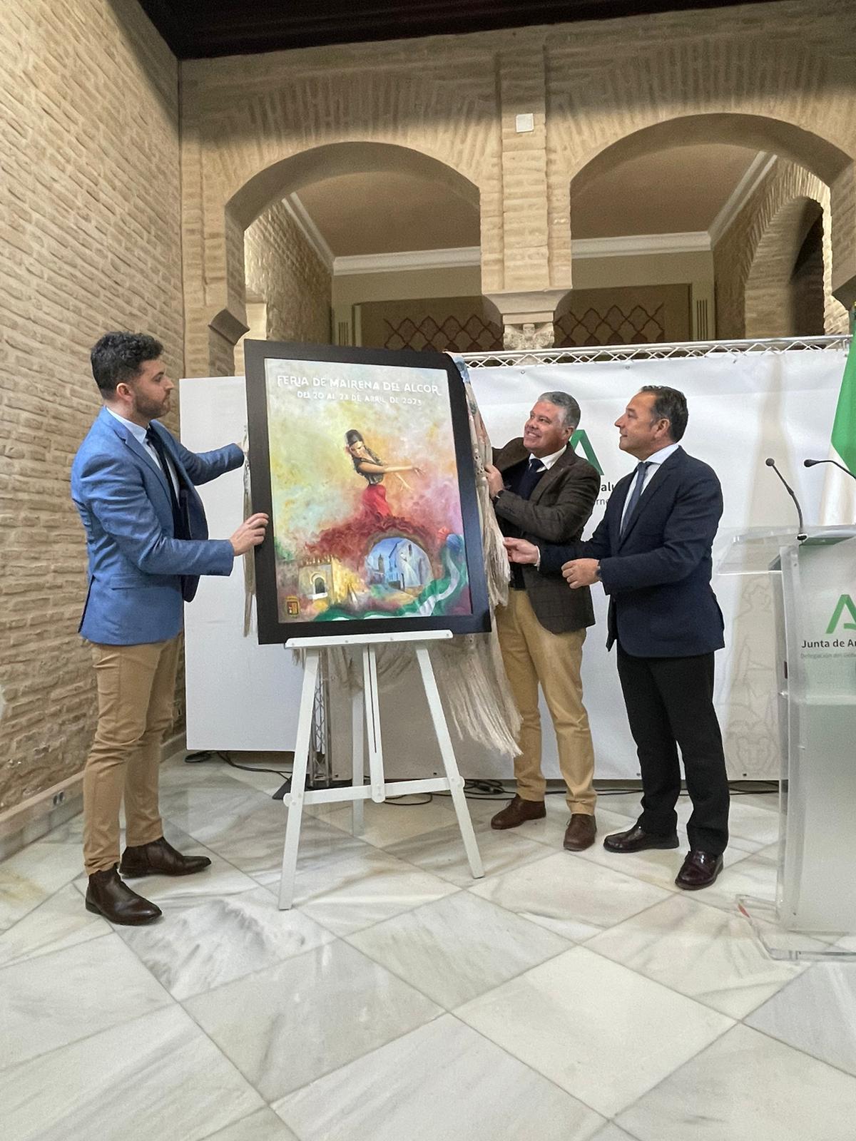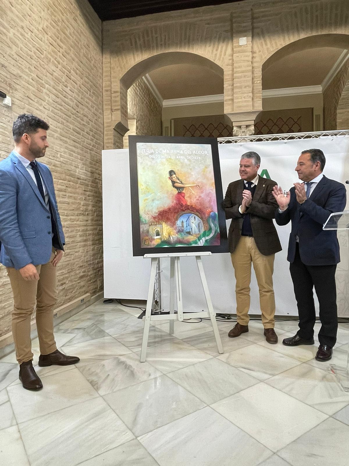 La Delegación del Gobierno de la Junta en Sevilla ha acogido la presentación del cartel anunciador de la Feria de Mairena del Alcor 2023, obra de Miguel Cordero. Han asistido el propio autor junto a su familia, el delegado del Gobierno en la Junta de Andalucía en Sevilla, Ricardo Sánchez, el alcalde, Juanma López, y concejales de la Corporación mairenera.
