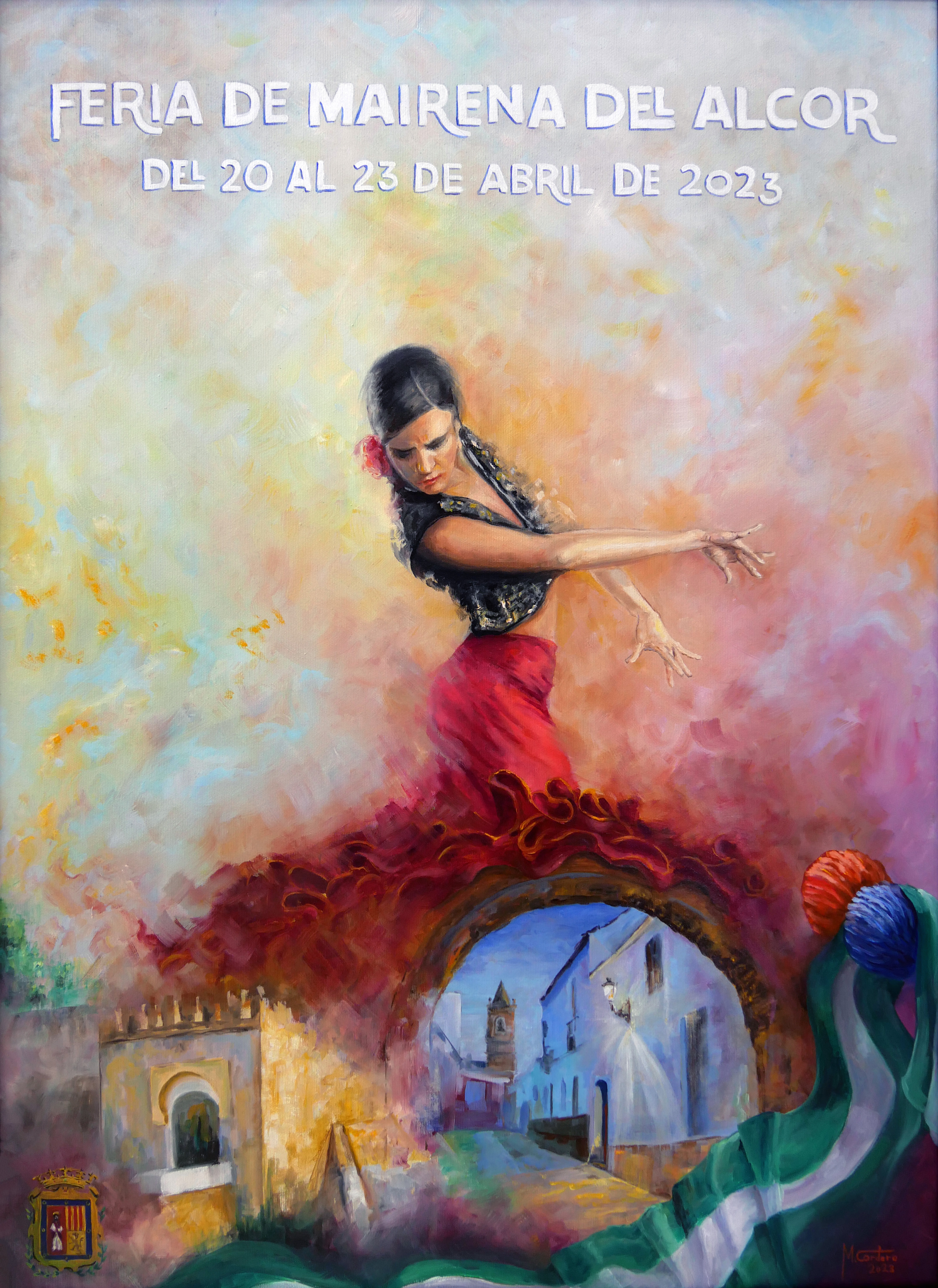 En esta obra del artista mairenero sobresale en primer plano la figura de una flamenca bailando una sevillana. Convertida en símbolo de la feria, con actitud elegante, demostrando fuerza y virtuosismo a través de su lenguaje corporal. Con gesto firme y decisivo, nos muestra, al abrigo de su falda, dos lugares emblemáticos de Mairena, el Castillo y la famosa calle del Arco.