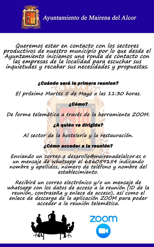 La reactivación de los sectores productivos de nuestro municipio es algo que nos preocupa, y por ello queremos realizar mediante videoconferencia, reuniones para tal fin, con el objetivo de escuchar las inquietudes y recabar las necesidades y propuestas de nuestras empresas de cara a buscar vías de colaboración.