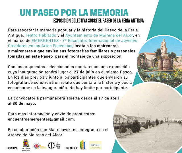 Para rescatar la memoria popular y la historia del Paseo de la Feria Antigua, Teatro Habitado y el Ayuntamiento de Mairena del Alcor, en el marco de EMERGENTES - 7º Encuentro Internacional de Jóvenes Creadores en las Artes Escénicas, invita a los maireneros a que envíen sus fotografías familiares o personales tomadas en este Paseo, para el montaje de una exposición.