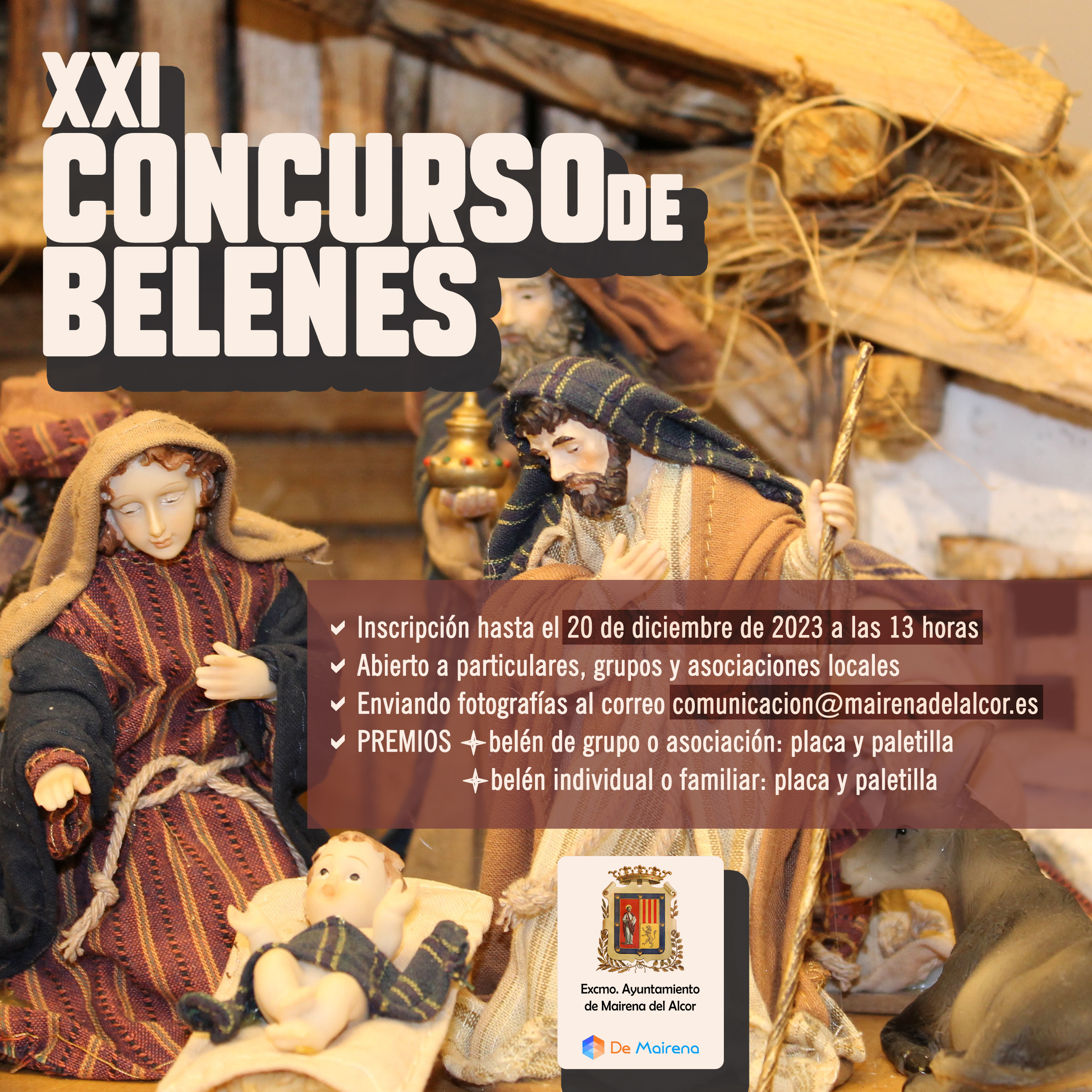 El Ayuntamiento convoca el XXI Concurso de Belenes, en el marco de las acciones de fomento a la cultura navideña y con el objetivo de dinamizar y poner en valor el trabajo que particulares, grupos y asociaciones de Mairena del Alcor llevan a cabo en el montaje de belenes. Para participar tan solo es necesario enviar tres fotografías del belén participante y datos de contacto -nombre, apellidos y teléfono- al correo comunicacion@mairenadelalcor.es antes de las 13 horas del día 20 de diciembre.