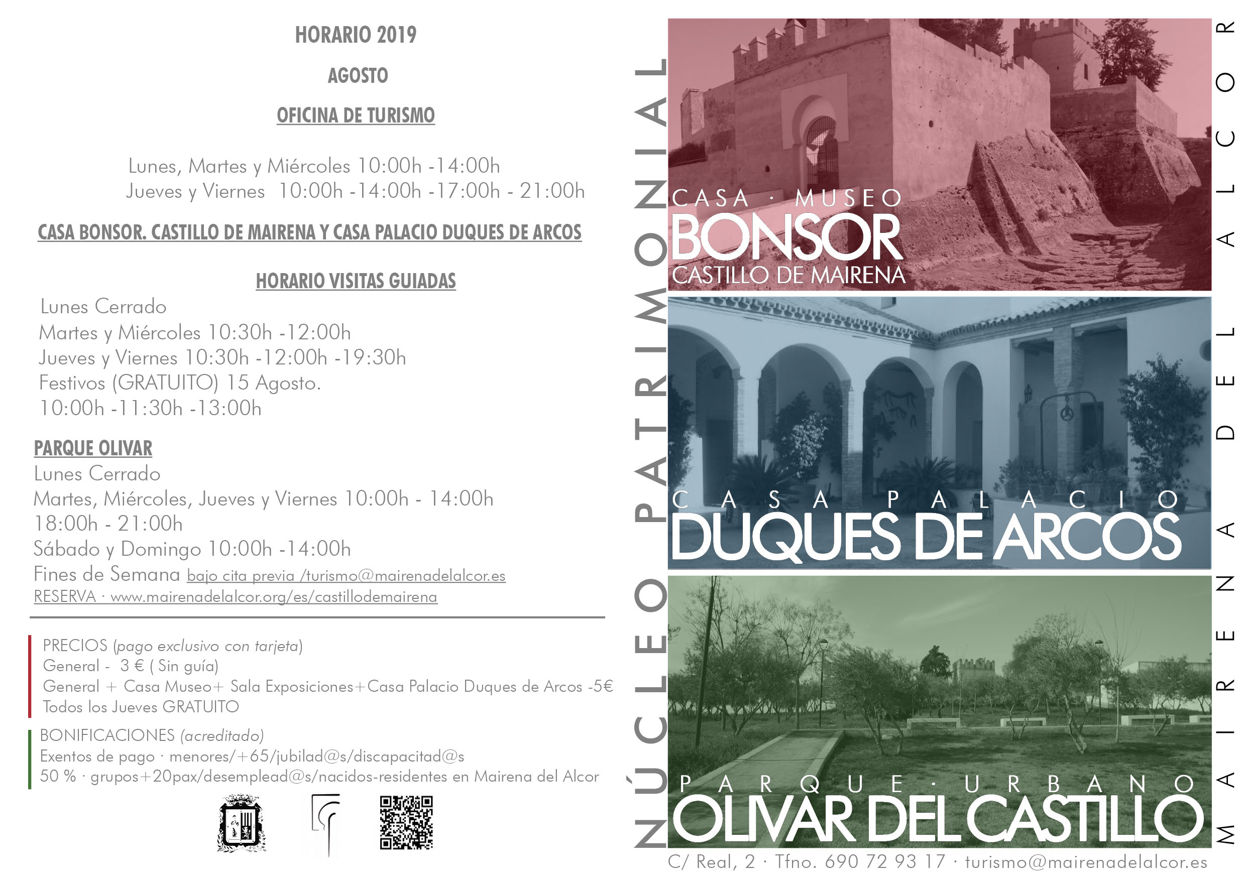 Turismo difunde el horario de visitas del núcleo patrimonial, integrado por el Castillo de Mairena, la Casa Palacio de los Duques de Arcos y el Parque del Olivar, para el mes de agosto. Incluye visita gratuita el día festivo 15 de agosto. La reserva de entradas se efectúa en este enlace.
