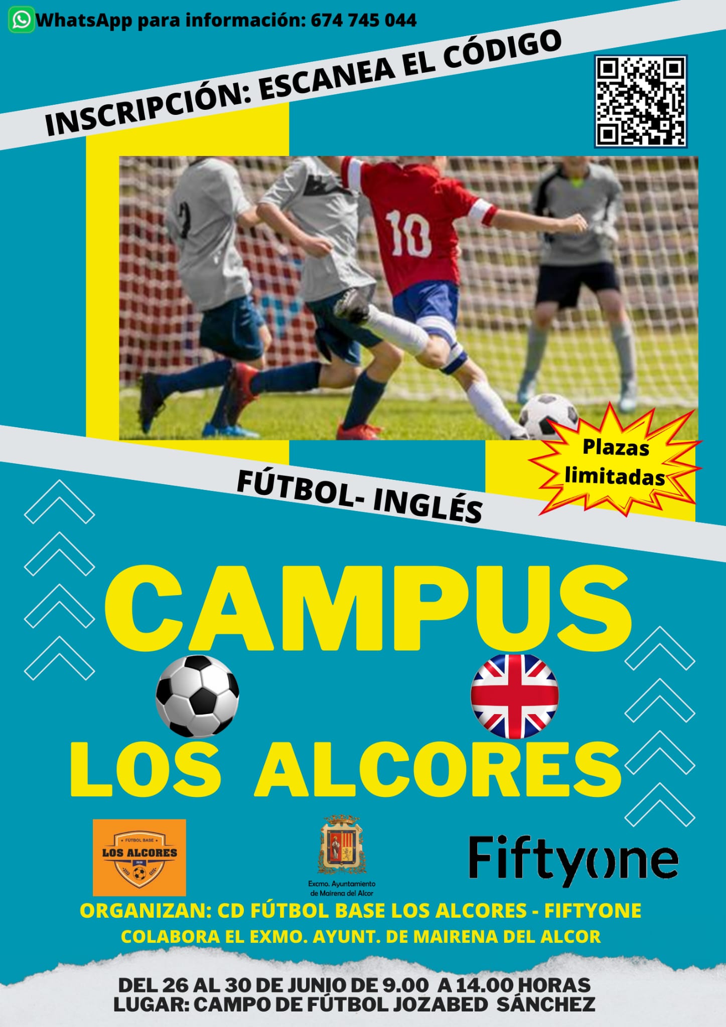 Campus Lúdico Deportivo, donde el eje vertebral es el fútbol y el inglés. Este Campus, organizado por Alonso Ramírez, delegado Provincial del Comité Técnico de Entrenadores de la Real Federación Andaluza de Fútbol y Entrenador Nacional, junto con Adrián Vico, CEO de Fiftyone S.L. y director deportivo, combinará el fútbol y el inglés utilizando una metodología específica destinada a niños y niñas de 9 a 13 años. El horario será de 9 a 14 horas del 26 al 30 de junio en las instalaciones deportivas.