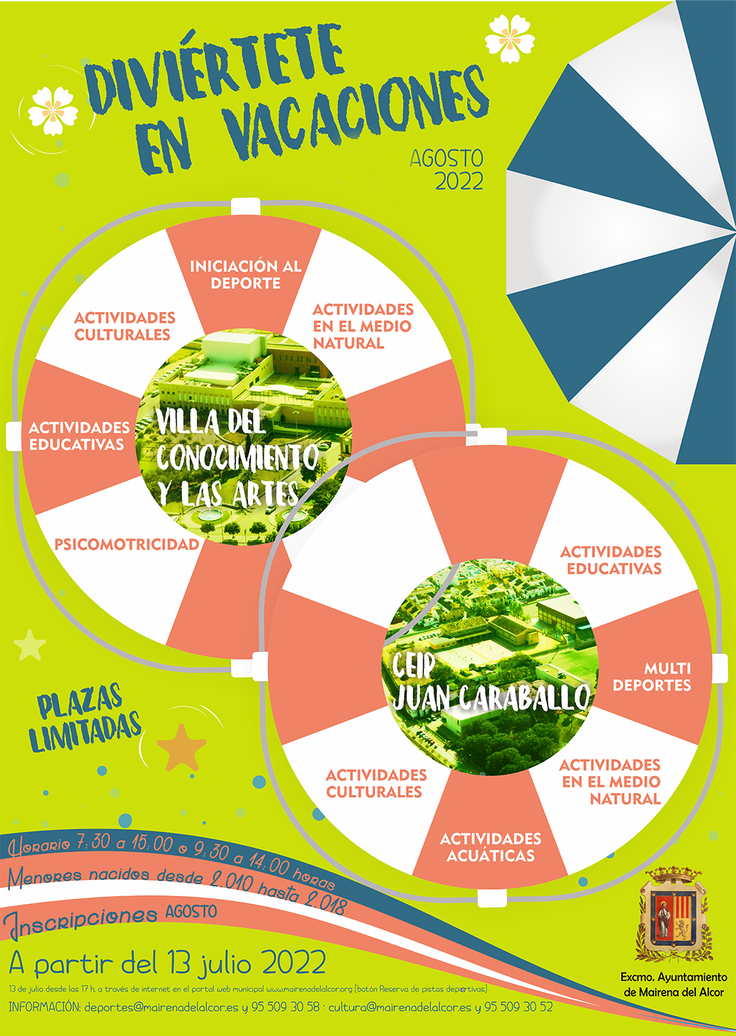 El miércoles 13 de julio a las 17 horas abre el plazo de inscripción telemática a la escuela de verano ‘Diviértete en Vacaciones’ para la mensualidad de agosto. Esta edición va dirigida a menores nacidos entre los años 2010 a 2018 y se desarrolla en dos sedes, el colegio Juan Caraballo Manfredi y la Villa del Conocimiento y las Artes.
