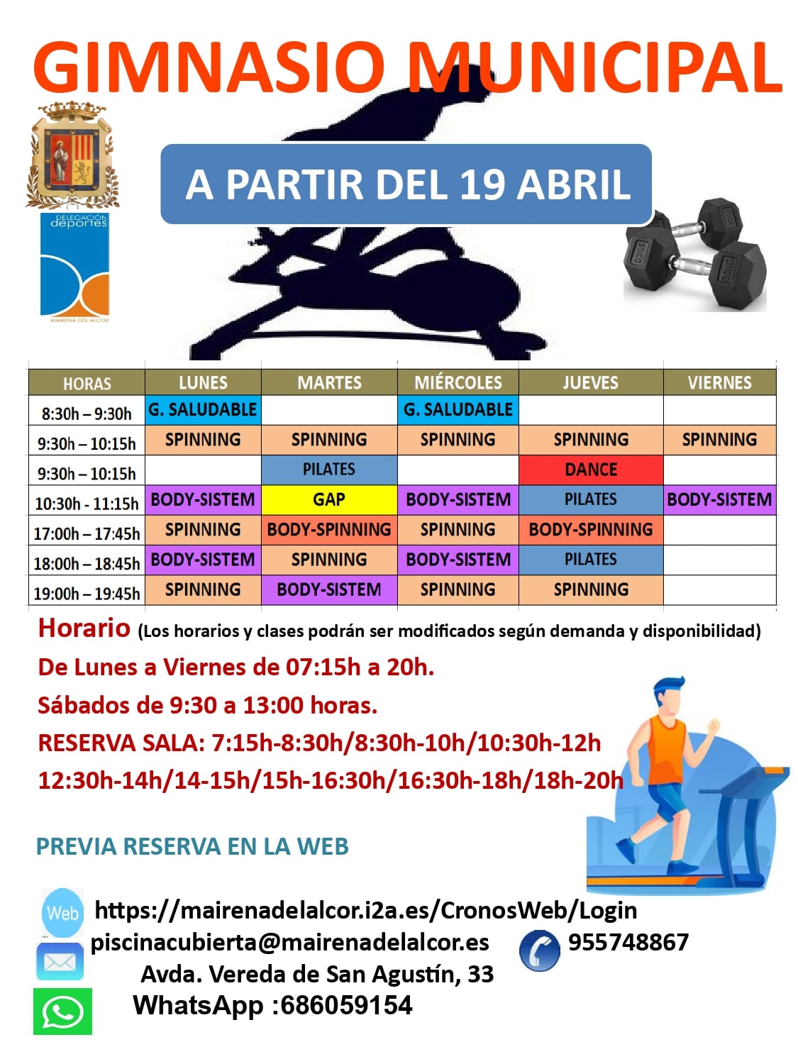 NUEVOS HORARIOS EN GIMNASIO Y PISCINA MUNICIPAL A PARTIR DEL 19 DE ABRIL