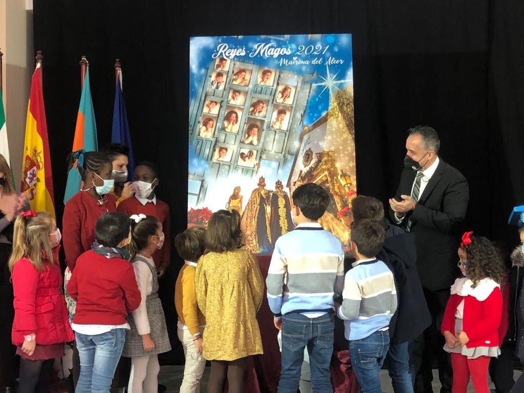 El elemento principal del cartel es el ventanal con las caras de esos niños y niñas de Mairena donde expresan ilusión, inocencia y ansias por la llegada de los Reyes Magos a sus casas.