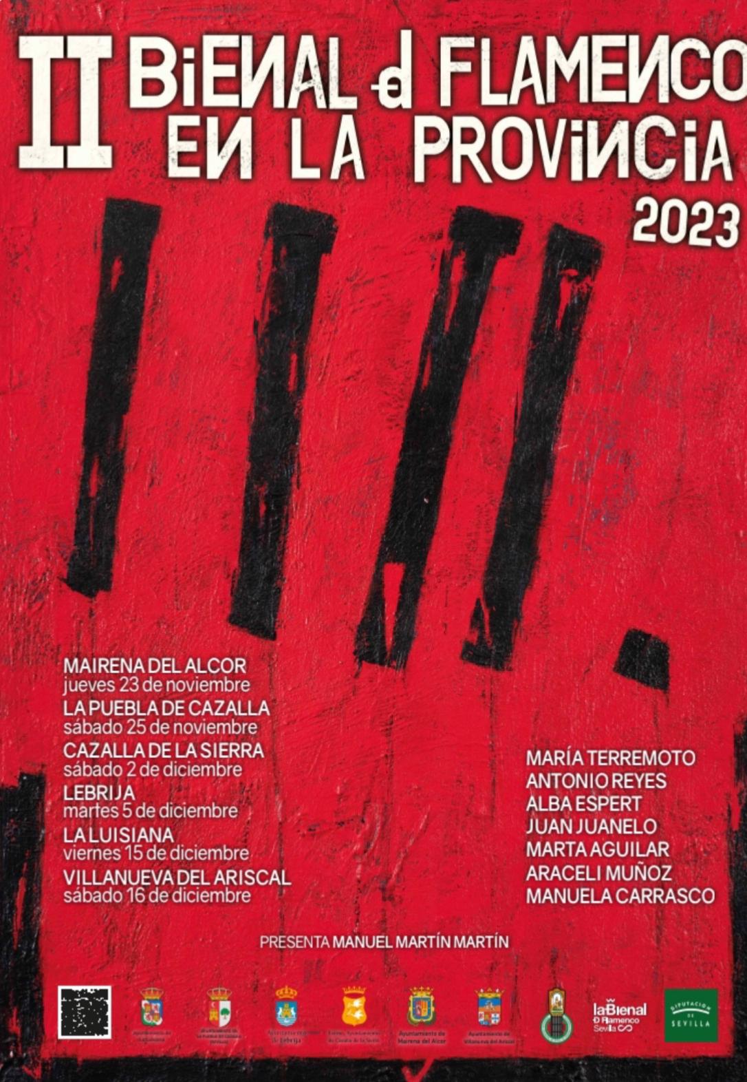La provincia de Sevilla disfruta de la Bienal de Flamenco en los años impares como es este 2023, el siguiente al de su realización en la capital hispalense, con la actuación de una selección de artistas que han participado en el certamen matriz actuando en los espacios escénicos locales. En Mairena del Alcor actuarán al cante María Terremoto Hija, Marta Aguilar y al baile Manuela Carrasco. Presenta Manuel Martín Martín.