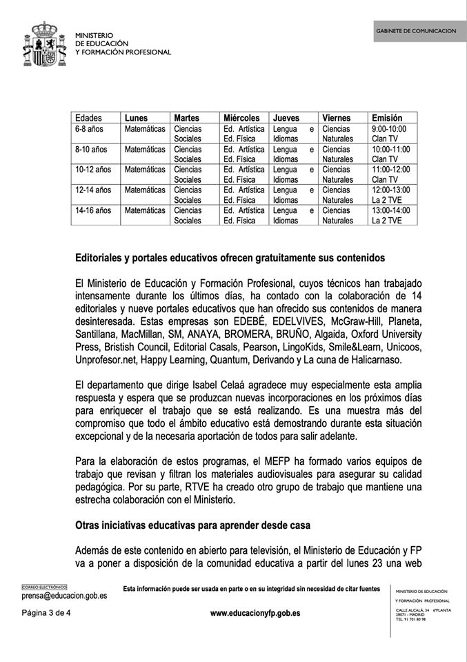 Se trata de una programación especial de cinco horas diarias de contenidos educativos que se emitirá en abierto durante las mañanas, de lunes a viernes, en Clan TV y en La 2 de TVE.