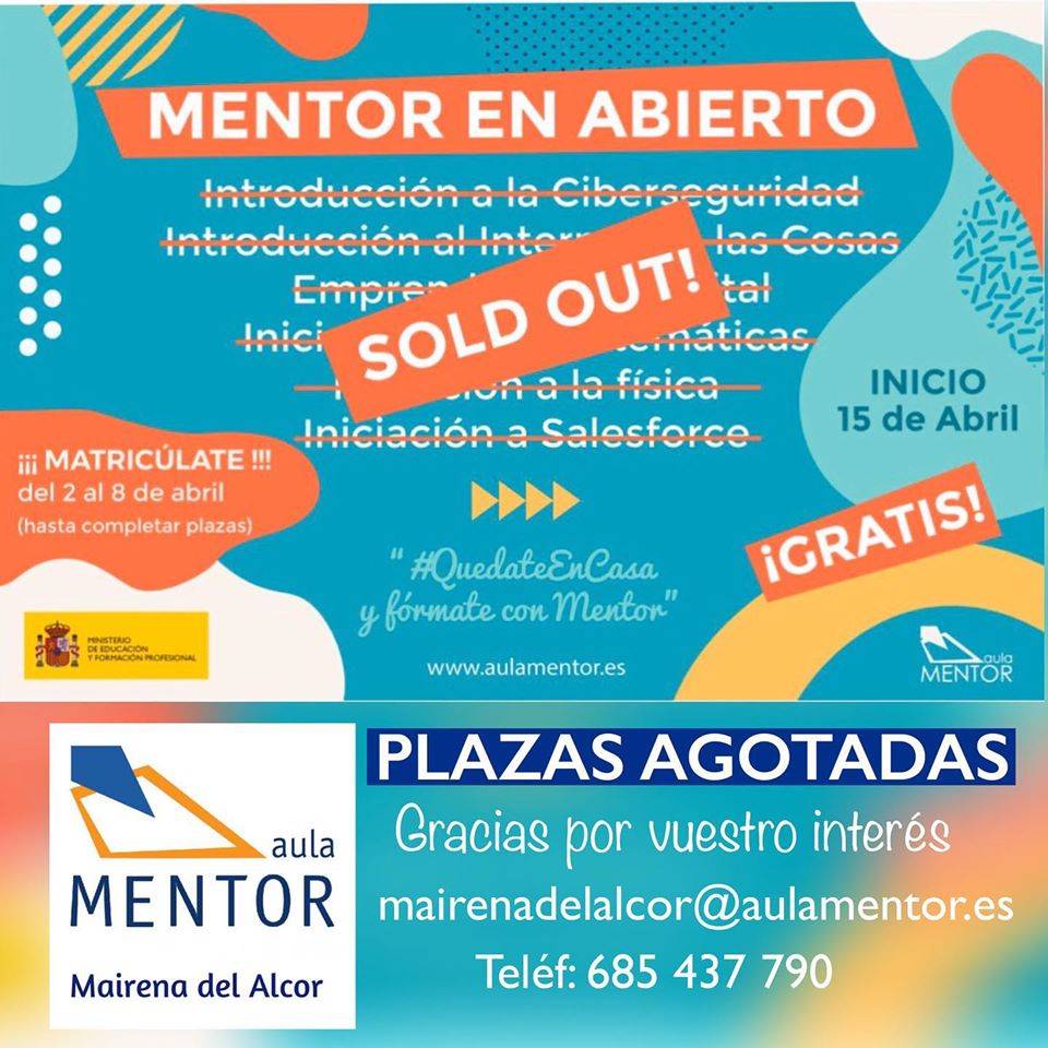 La inscripción a los cursos se realiza de forma gratuita en el plazo comprendido entre los días 2 al 8 de abril a través del Aula Mentor Mairena del Alcor, enviando un correo a mairenadelalcor@aulamentor.es o llamando al número 685 437 790. Las plazas son limitadas y se adjudicarán por riguroso orden de inscripción.