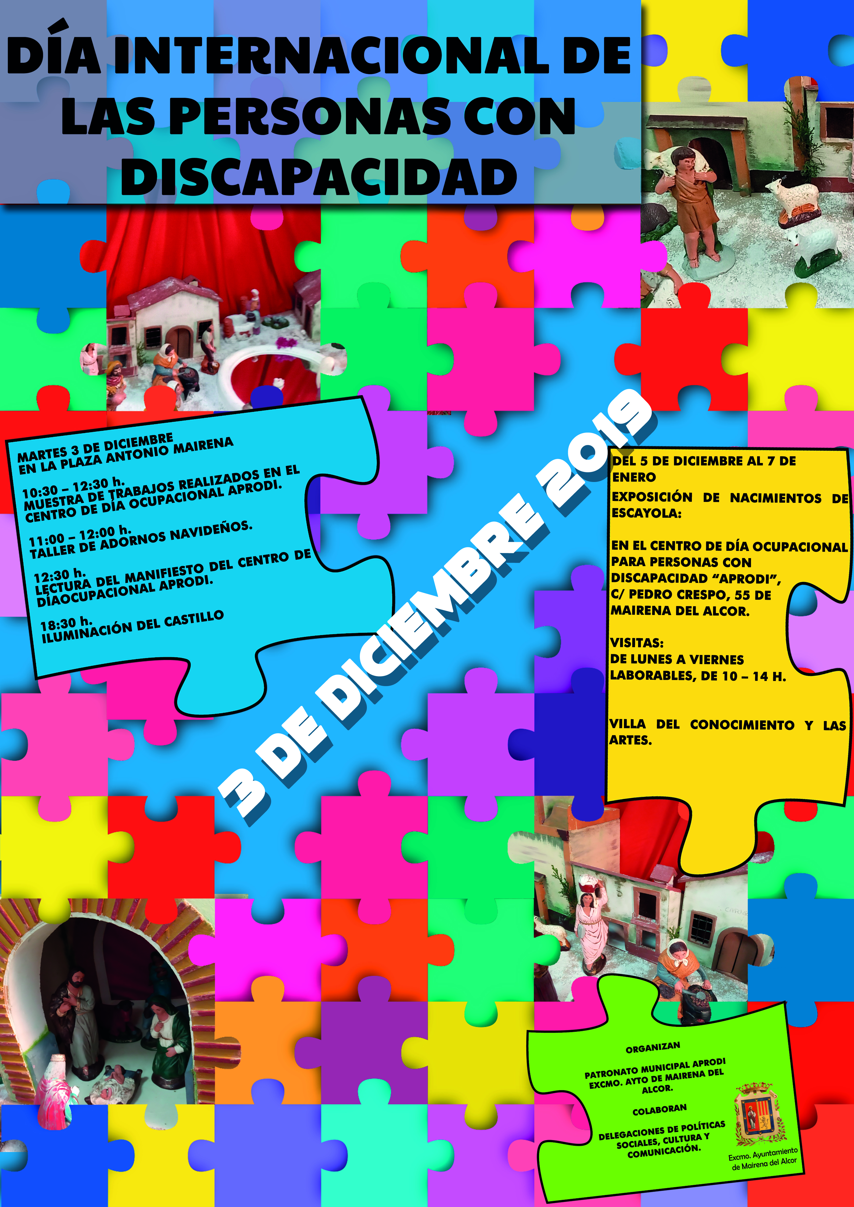Para conmemorarlo, el día 3 en la plaza Antonio Mairena, APRODI expondrá los trabajos realziados en su centro de día ocupacional de 10.30 a 12.30 horas. A las 11.00 horas tendrá lugar un taller de adornos navideños y a las 12.30 horas se procederá a la lectura del manifiesto institucional. Por la tarde, a las 18.30 horas, se iluminará el castillo de color celeste para visibilizar al colectivo de personas con discapacidad. Del 5 de diciembre al 7 de enero estará la exposición de nacimientos tanto en el Centro de Día Ocupacional APRODI como en la Villa del Conocimiento y las Artes.