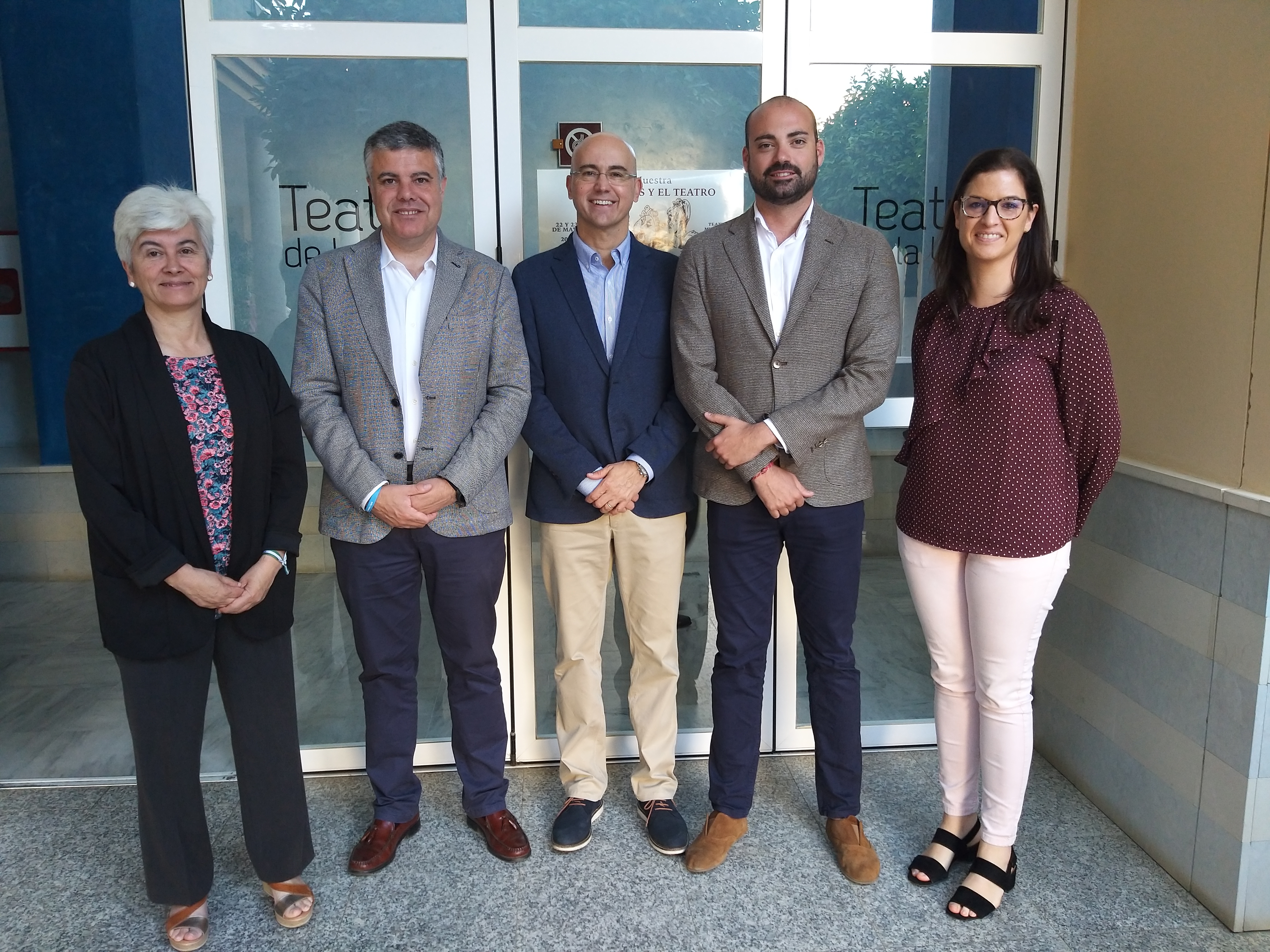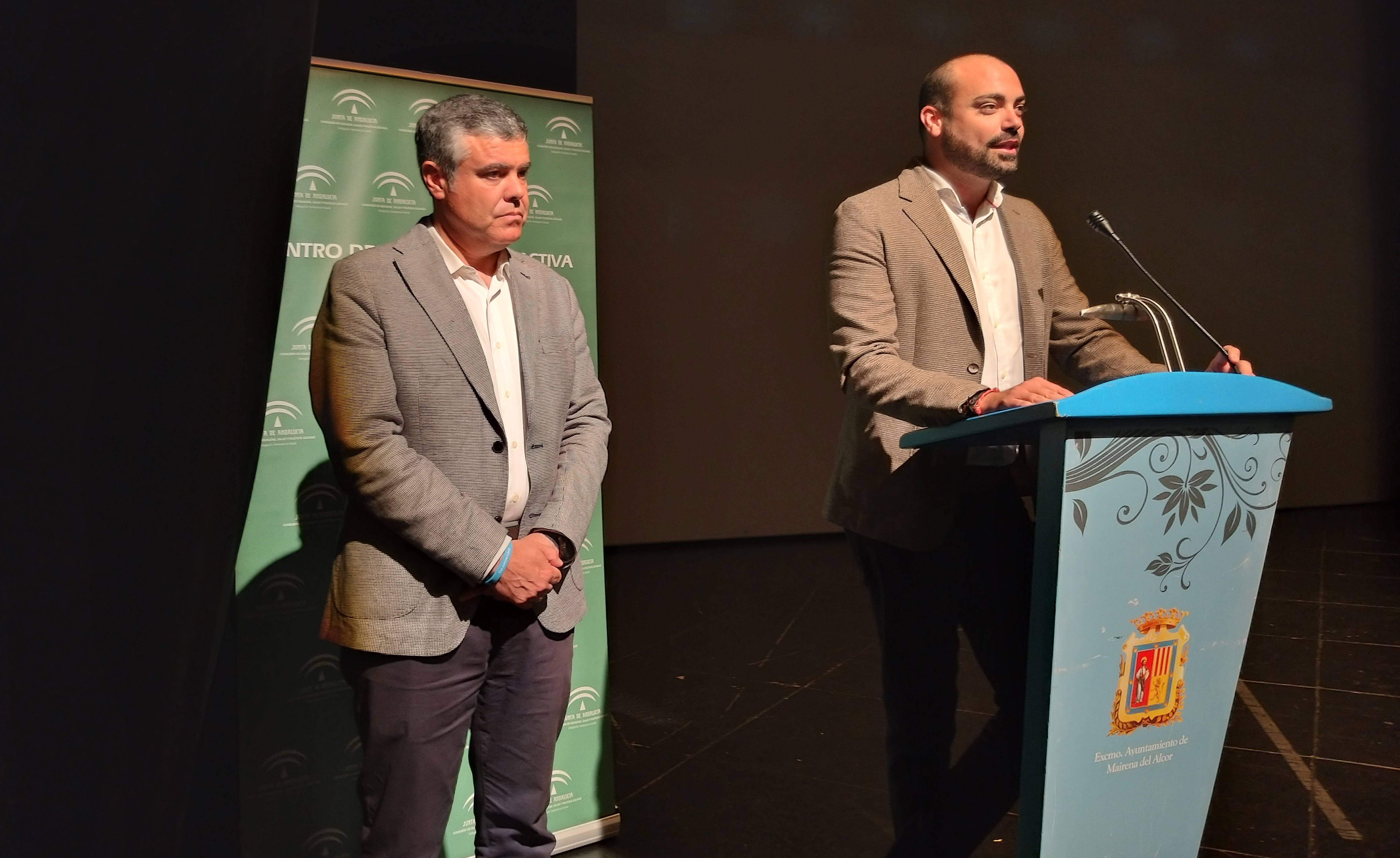 El director general de Personas Mayores y Pensiones No Contributivas, Daniel Salvatierra; el delegado territorial de Educación, Deporte, Igualdad, Políticas Sociales y Conciliación, Joaquín Pérez, y el alcalde de Mairena del Alcor, Juan Manuel López, asistieron a la inauguración de la muestra de teatro.