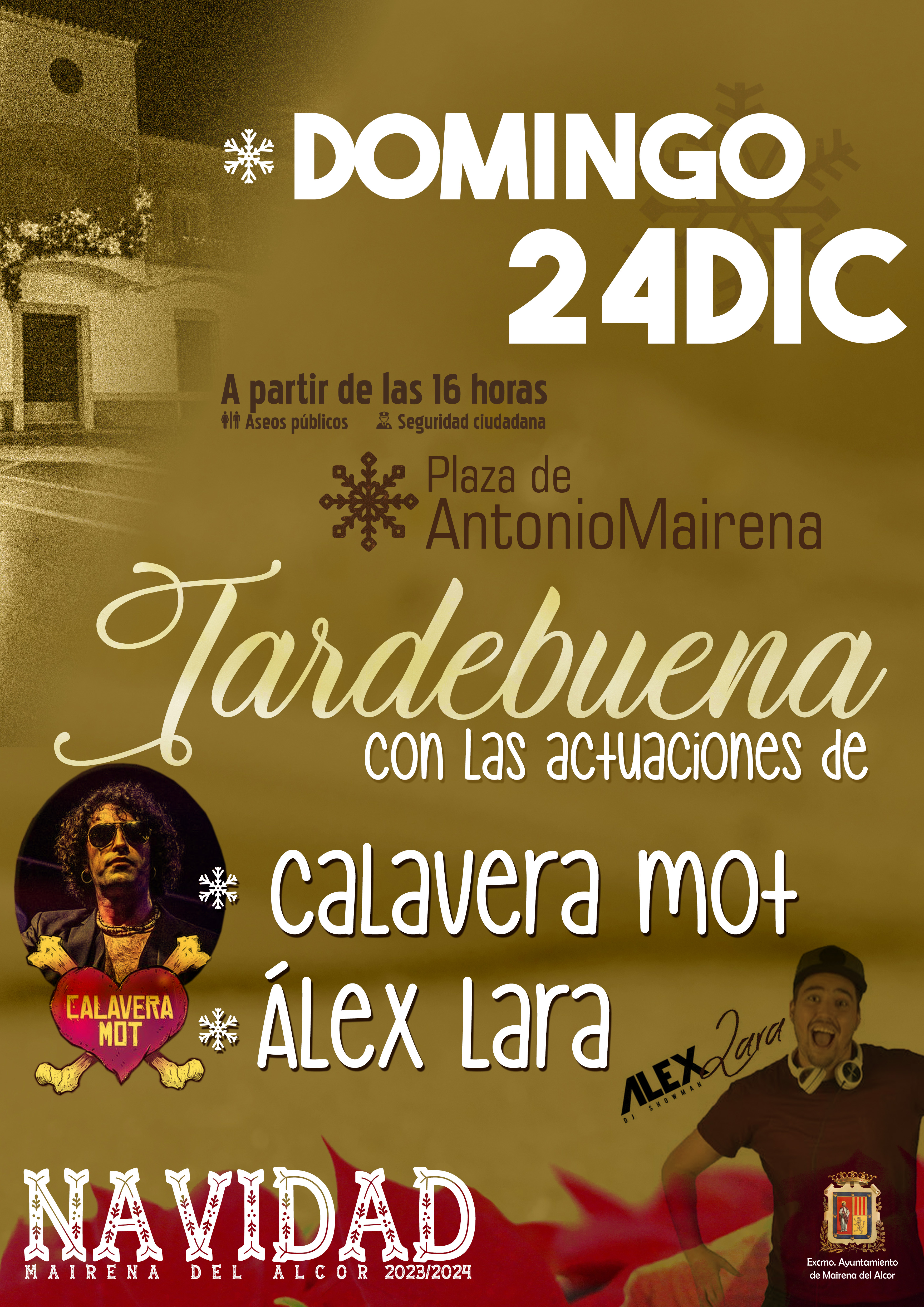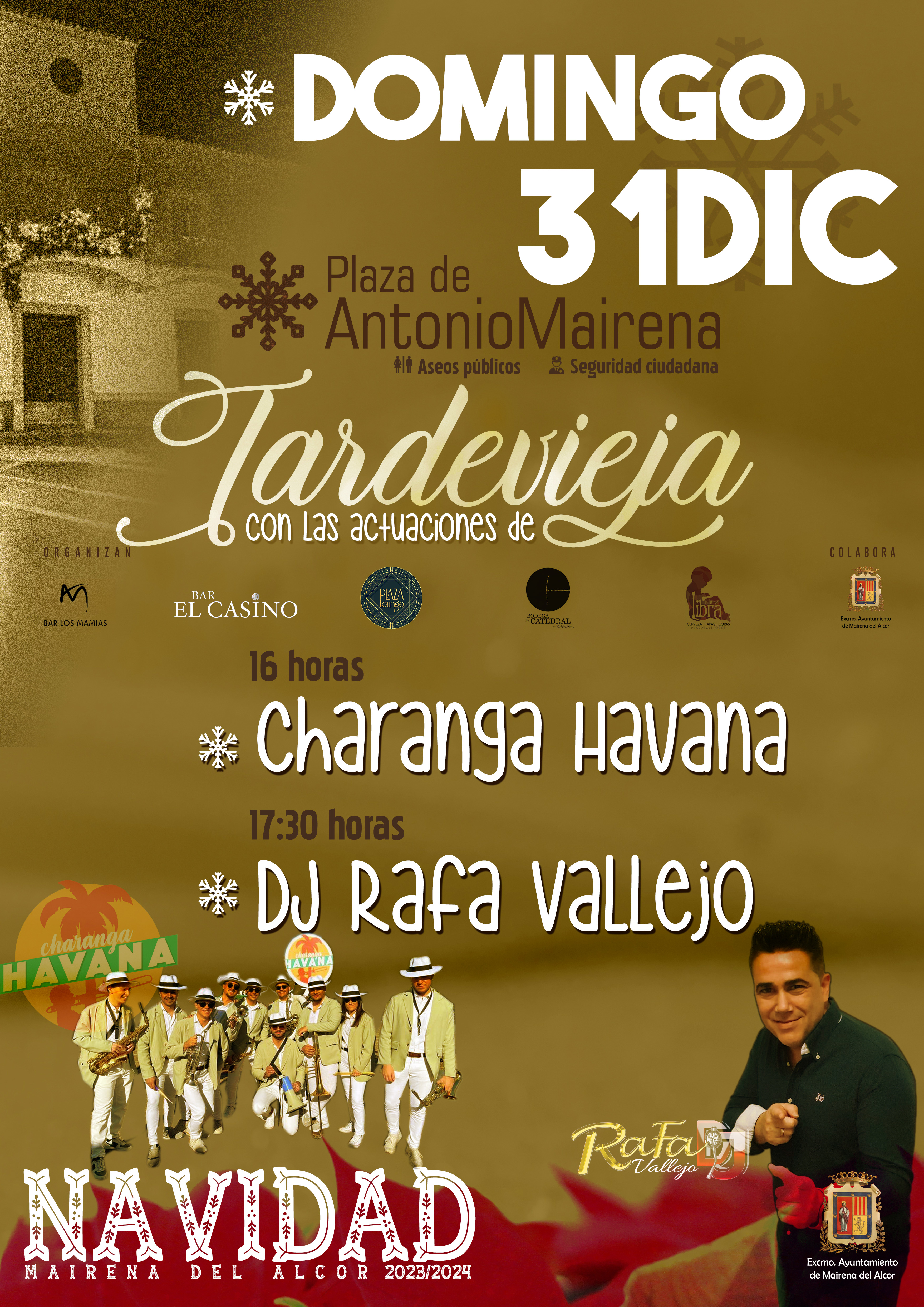 Calavera mot y Álex Lara animarán la Tardebuena a partir de las 16 horas. La Tardevieja, organizada por los negocios de hostelería cercanos con la colaboración del Ayuntamiento, estará amenizada por la charanga local Havana a las 16 horas y el dj mairerenero Rafa Vallejo a partir de las 17:30 horas.