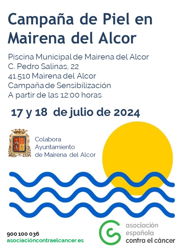 El concejal de Deportes, Javi Rodríguez, y Loli Gavira de la Junta AECC Junta Local Mairena del Alcor han presentado la Campaña de Prevención del Cáncer de Piel que se desarrollará los días 17 y 18 de julio en las instalaciones de la piscina de verano.