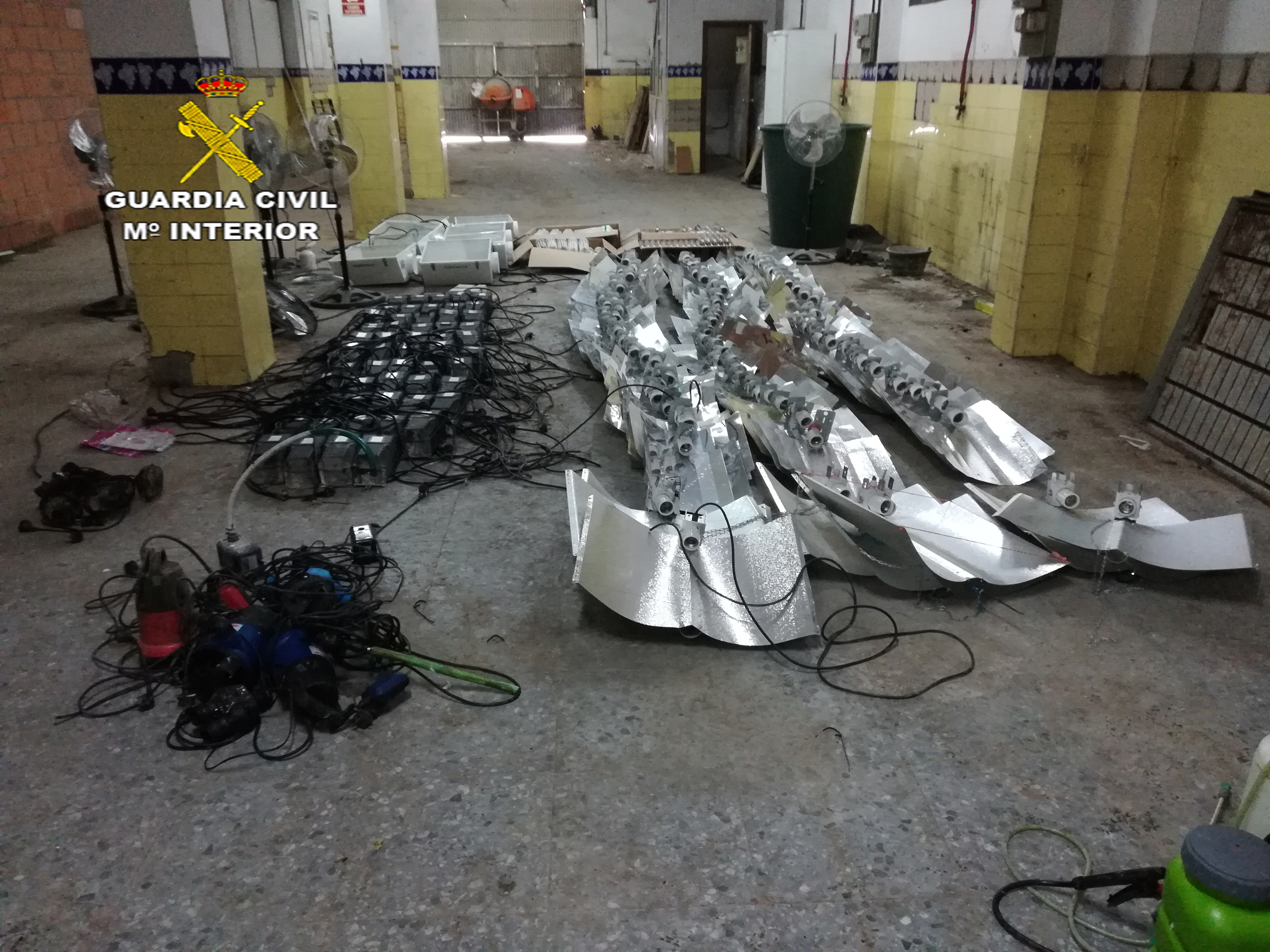 Una vez en el interior, la Guardia Civil comprueba que el antiguo taller se encuentra totalmente habilitado para el cultivo de marihuana. Un total de 10 habitaciones están preparadas para su uso exclusivo de esta actividad, contando con 11 equipos de aire acondicionado, 142 lámparas, 135 reflectores de bombillas de 600 vatios y más de 10.000 macetas vacías que habían sido utilizadas para las plantas.