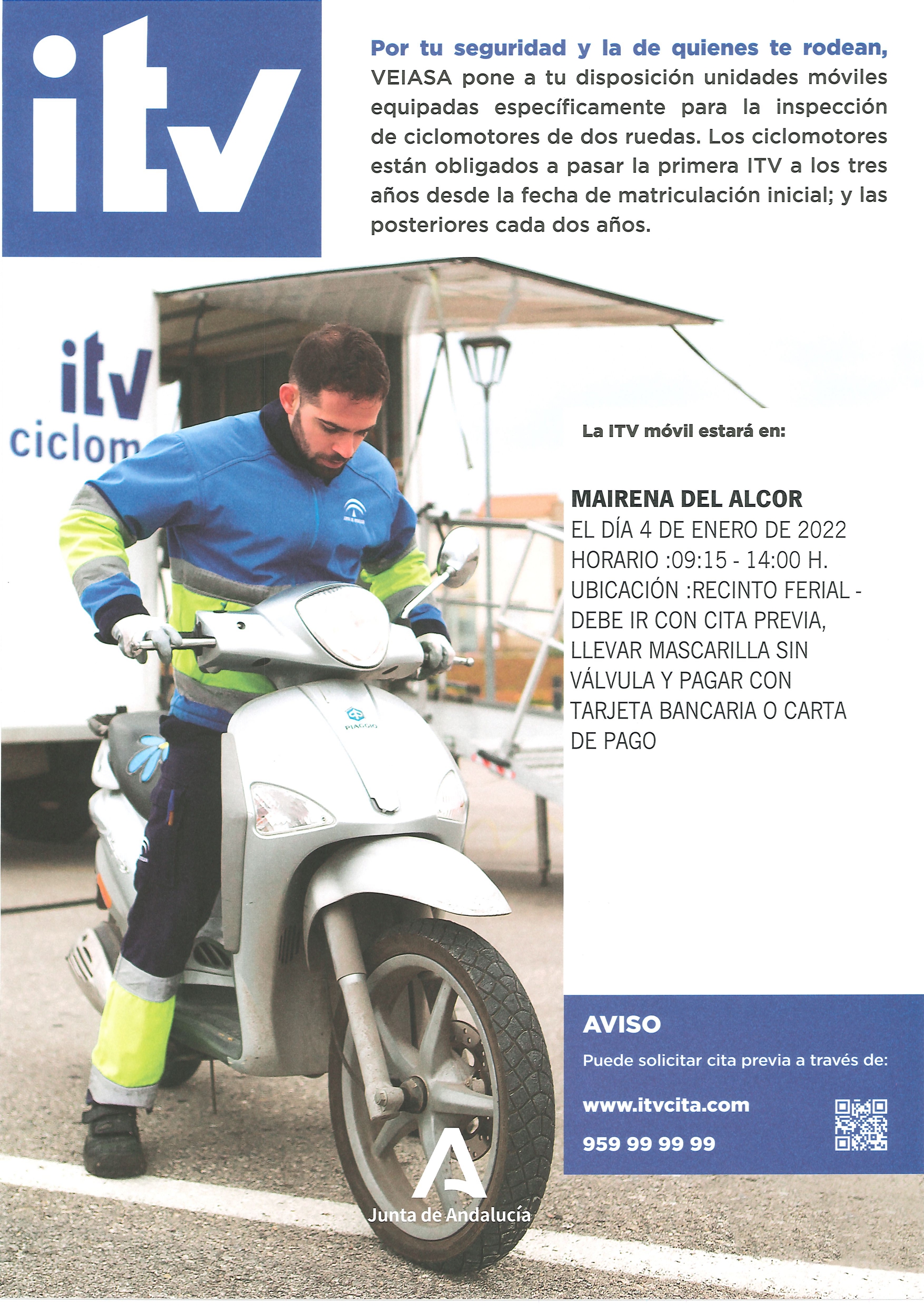 La Policía Local de Mairena del Alcor informa que los ciclomotores de dos ruedas están obligados a pasar la primera ITV a los tres años desde la fecha de matriculación inicial. Y a partir de ahí cada dos años.