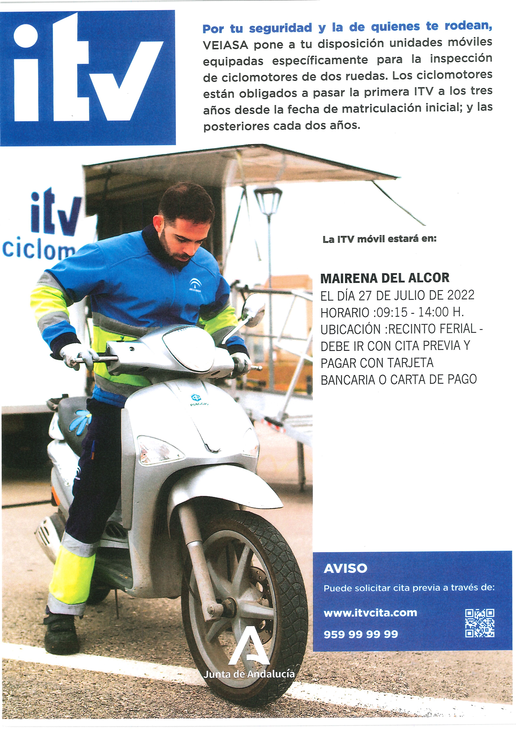La Policía Local de Mairena del Alcor informa que los ciclomotores de dos ruedas están obligados a pasar la primera ITV a los tres años desde la fecha de matriculación inicial. Y a partir de ahí cada dos años.