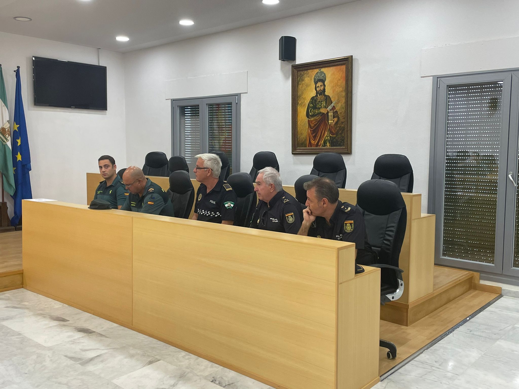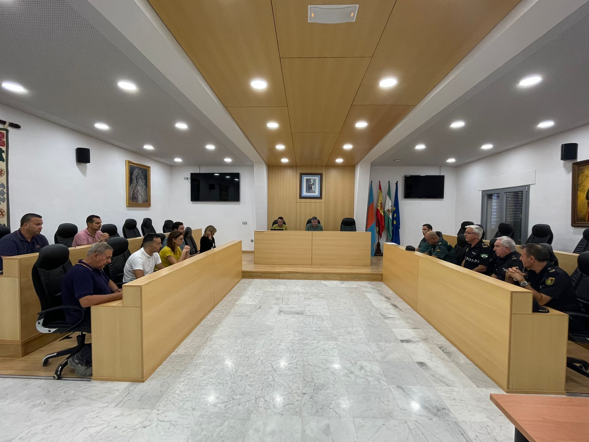 El alcalde, Juanma López, ha presidido la reunión a la que también han asistido los delegados de Fiestas Mayores, Limpieza Urbana y Seguridad Ciudadana, Gloria Guillén, José Romero y Juan Galocha, respectivamente. La hermana mayor de la hermandad, Ana Jiménez, acompañada de otros miembros de la junta de gobierno, el técnico de la Delegación de Cultura, Rubén Hernández, además de efectivos de la Policía Local, Guardia Civil y Policía Autonómica.