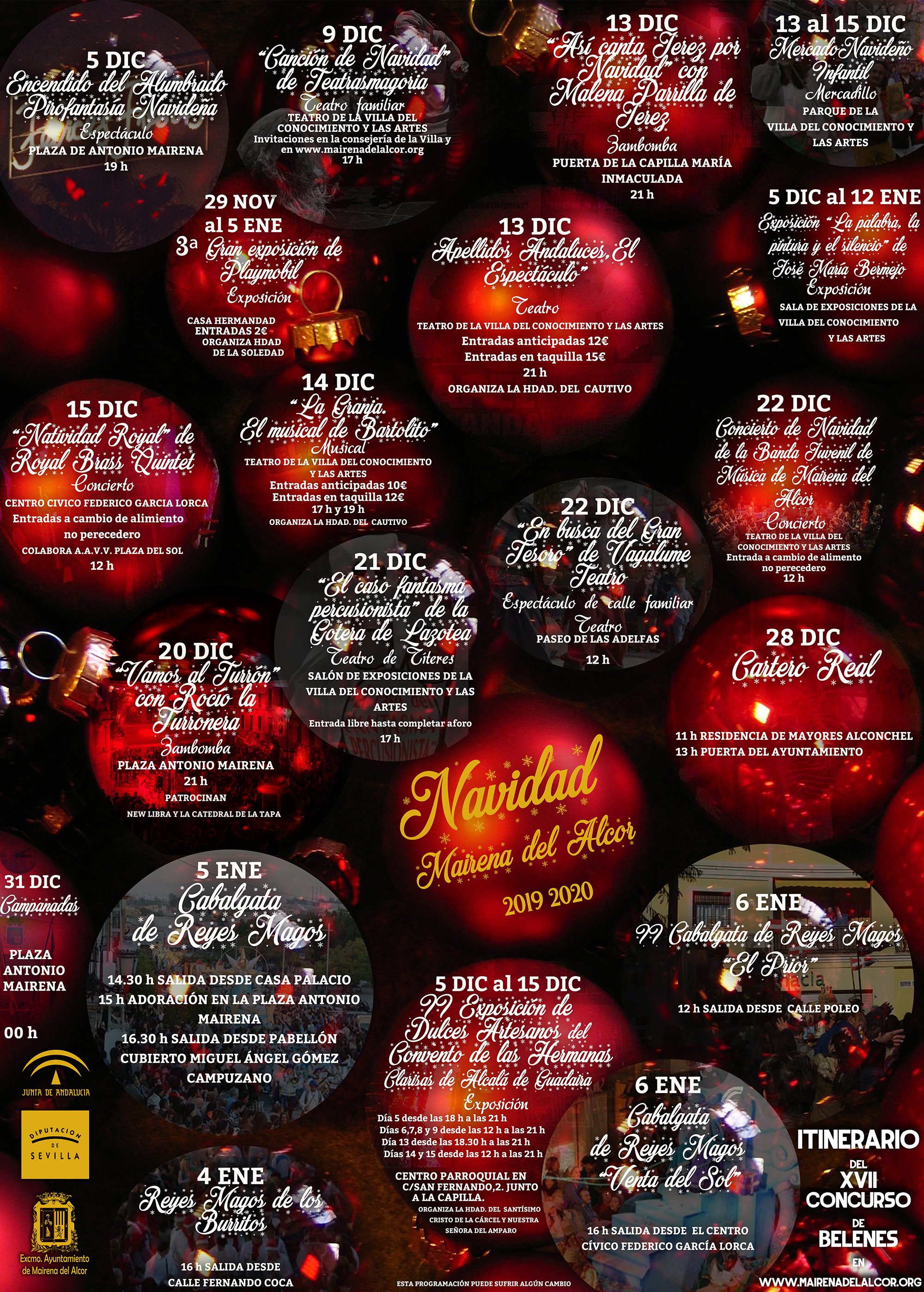 De esta forma, Mairena del Alcor dará la bienvenida a la época navideña, como manda la tradición, en vísperas del Puente de la Constitución y la Inmaculada. Las luces de Navidad se encenderán cada tarde de 18.30 a 2.00 horas, hasta el día 6 de enero de 2020. Además el Ayuntamiento ha elaborado una programación con más de 20 actividades para todos los públicos con zambombas, conciertos, un mercado navideño, exposiciones, teatros, los concursos de belenes, escaparates o christmas, entre otras.