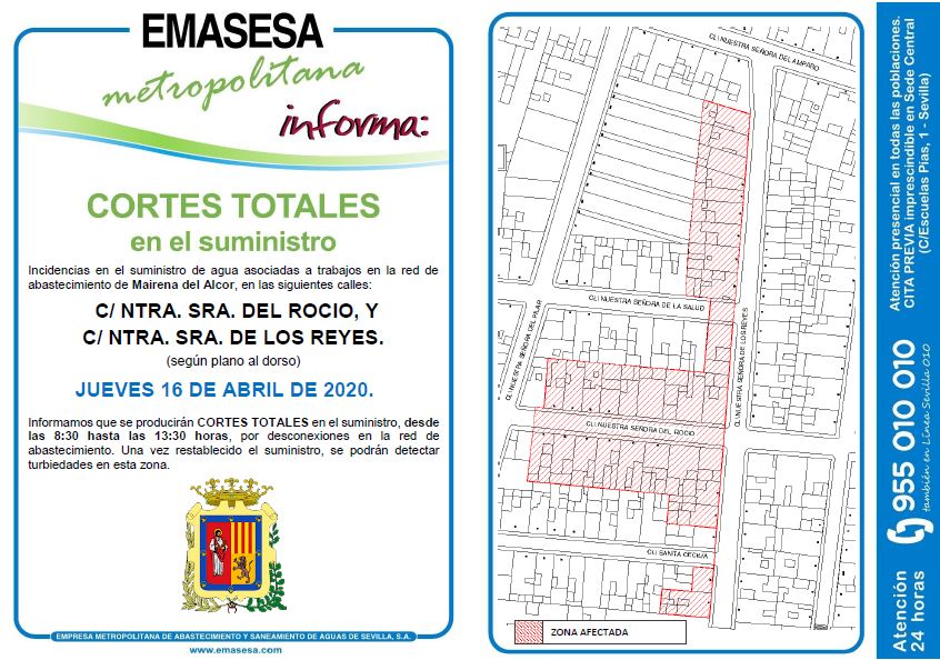 Emasesa Metropolitana informa que el jueves día 16 de abril, desde las 8.30 hasta las 13.30 horas, se producirán cortes totales en el suministro de agua en las calles Ntra. Sra. del Rocío y Ntra. Sra. de los Reyes.