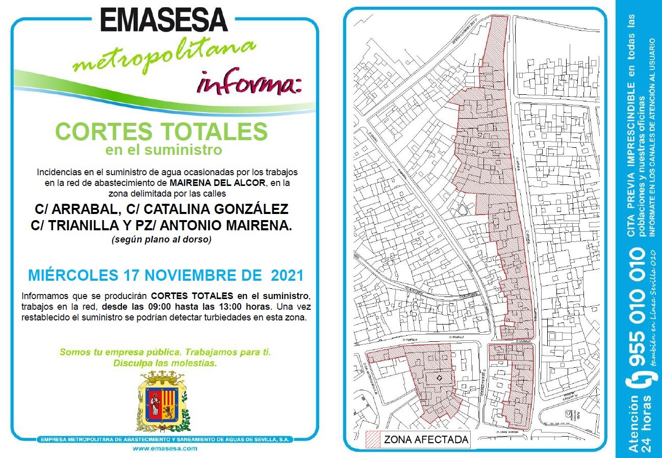 Emasesa Metropolitana informa que por trabajos en la red de abastecimiento, el miércoles 17 de noviembre de 9 a 13 horas, se producirán cortes totales en el suministro de agua en la zona comprendida por la plaza Antonio Mairena y las calles Arrabal, Catalina González y Trianilla.