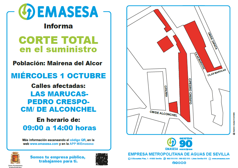 Emasesa Metropolitana informa que el miércoles 1 de octubre se producirán cortes totales en el suministro de agua en las calles las Marucas, Pedro Crespo y camino de Alconchel entre las 9:00 y 14:00 horas.