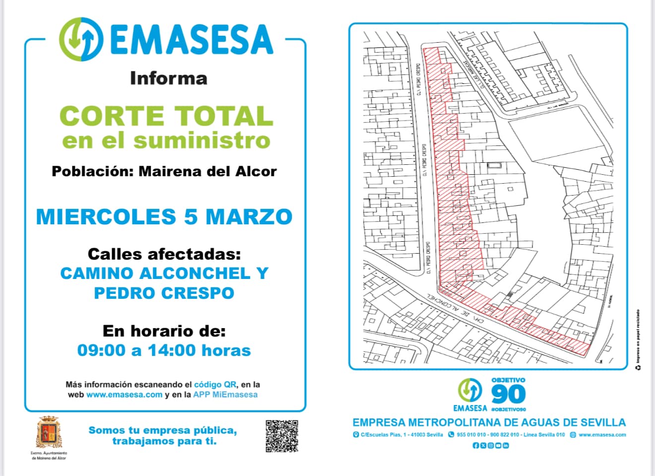 Emasesa Metropolitana informa que el miércoles 5 de marzo se producirá un corte total en el suministro de agua entre las 9 y 14 horas, en las calles Camino de Alconchel y Pedro Crespo.