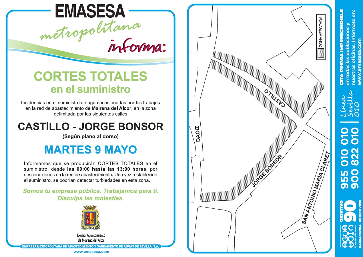 Emasesa Metropolitana informa que por trabajos en la red de abastecimiento, el martes 9 de mayo de 9.00 a 13.30 horas, se producirán cortes puntuales en el suministro de agua en las calles Castillo y Jorge Bonsor.