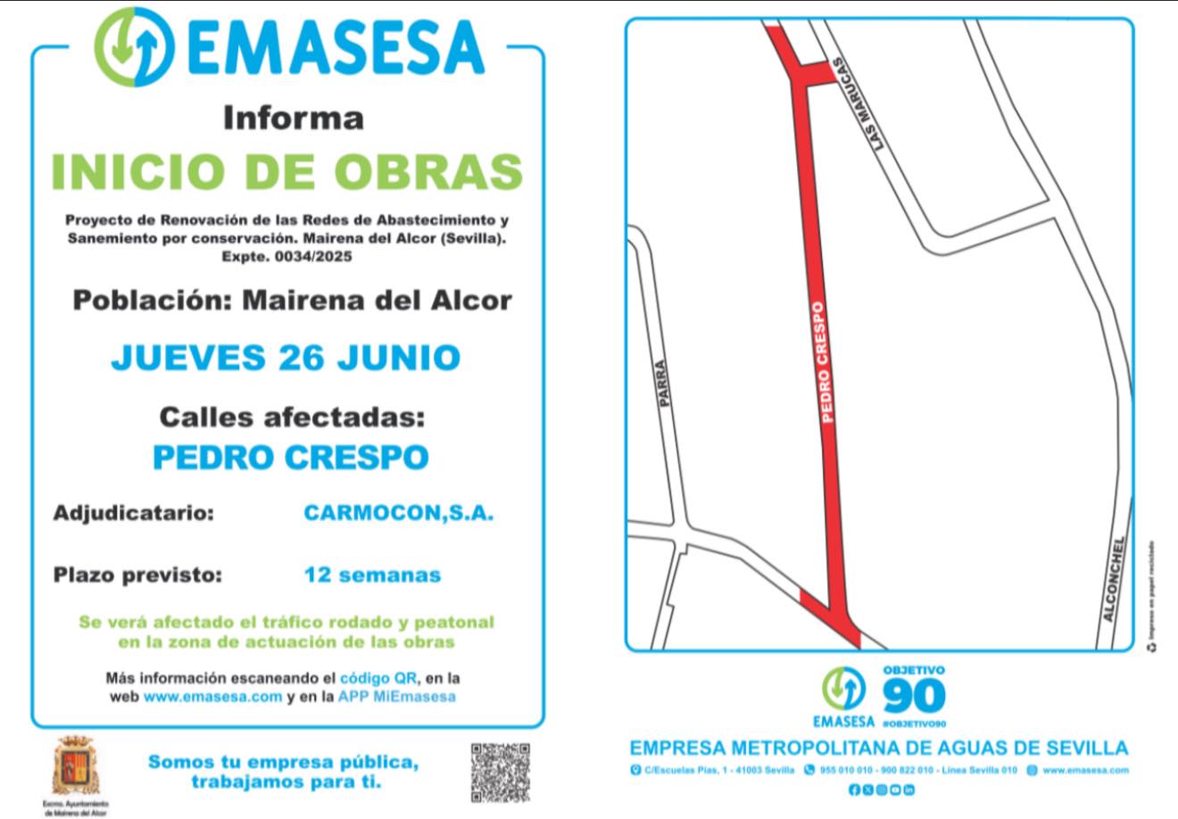 Emasesa informa que mañana jueves 26 de junio comienzan las obras de las redes de abastecimiento y saneamiento por conservación en la calle Pedro Crespo.