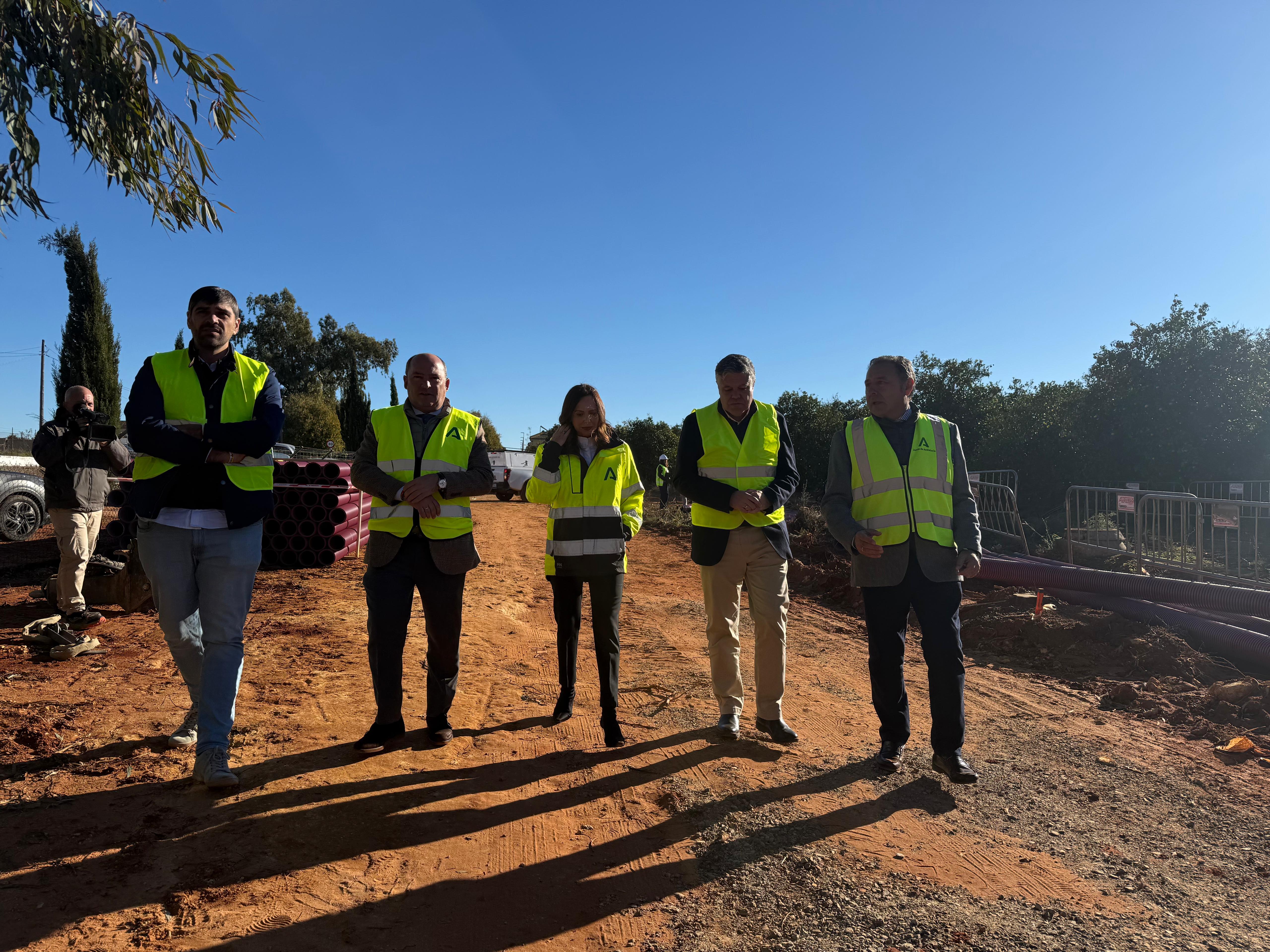 El alcalde, Juanma López; el delegado del Gobierno de la Junta de Andalucía en Sevilla, Ricardo Sánchez; y el delegado territorial de Fomento en la provincia, Francisco de Paula Juárez han acompañado a la consejera en la visita al arranque de estos trabajos.